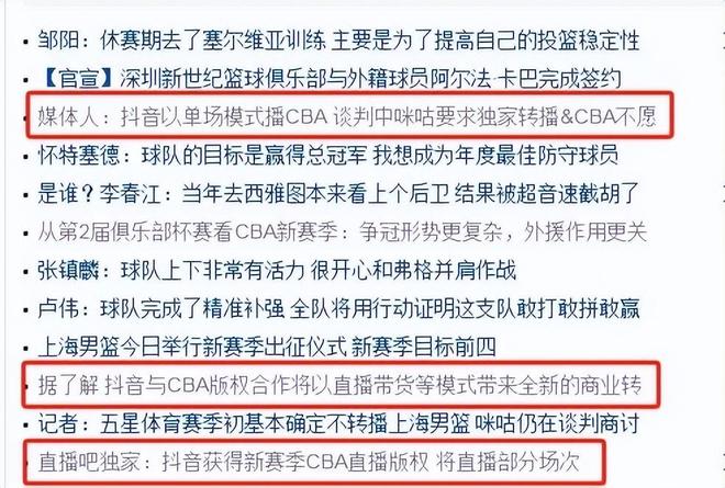 前几个赛季,CBA联赛一直都是某咕平台独家直播,据悉费用是五年20个亿,这还是姚明在任时签署的合同,这笔签约可以说是让CBA赚得盆满钵满。不过在这个休赛期里,某咕和CBA联赛的直播合同到期,双方也一直在为续约进行沟通,不过一直没有达成一致。就媒体人“导演我躺哪儿”透露,某咕依旧希望像上份合同一样,独家直播CBA联赛,但CBA公司领导不同意,希望任何平台都可以以单场的方式来购买版权。最终新赛季的CBA版权被某音获得。